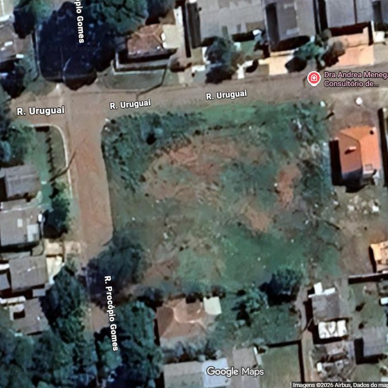 Um lote urbano com 560m2, medindo 14x40m, de frente para a Rua Uruguai, e outro com área de 880m2, medindo 22x40m, na esquina da Rua Uruguai com a Rua Procópio Gomes.